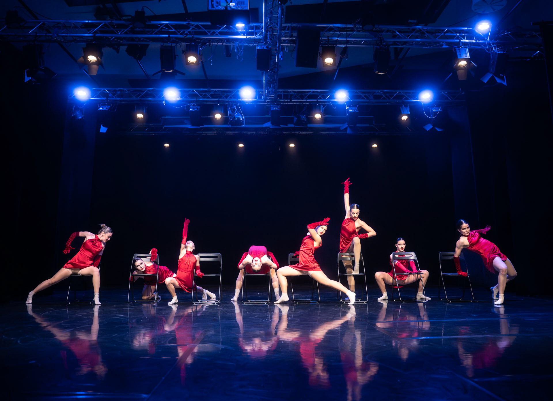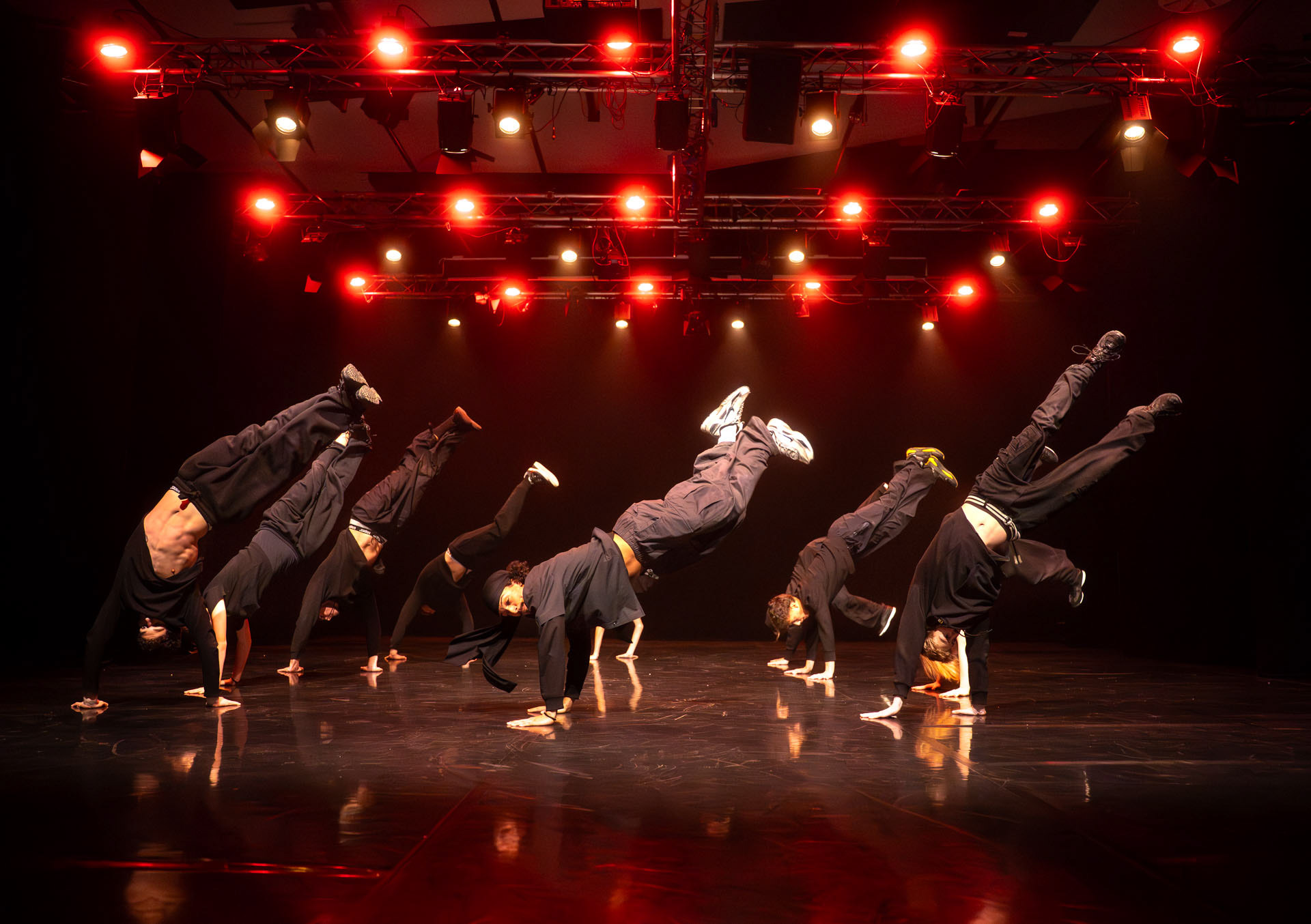 a hundred dancers storm the stage in sight.